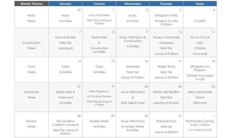Sample K-5th Summer Camp Calendar
